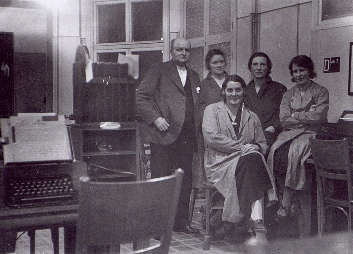 Stockholms telegrafstation omkring 1930. Fass. G.L. Andersson (Gla), Tgf Anna Stina Grandin (Dik) sittande, e.o. tgf. Ingrid Thunqvist längst t.h.