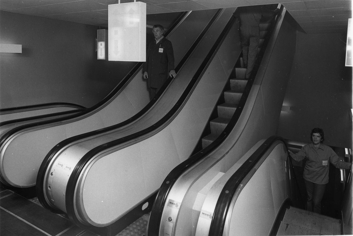Rulltrappa i övre verkstaden mellan personaldelen och den underliggande verkstadsdelen vid Volvofabriken i Torslanda.