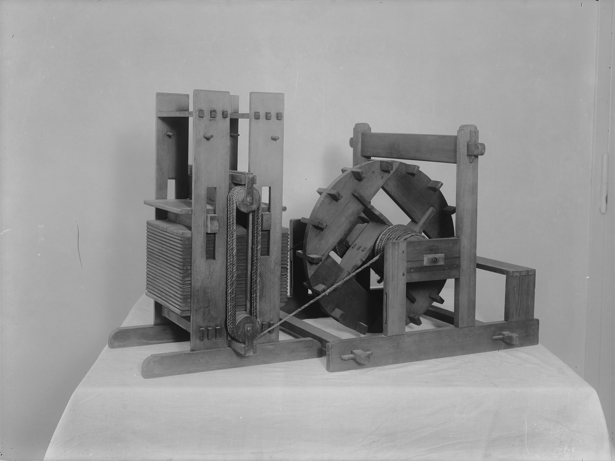 Modell av klädespress, konstruerad av Christopher Polhem på 1740-talet.