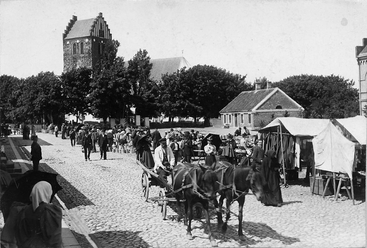 Torgmarknad i Båstad med stånd för försäljning av kläder. I bakgrunden Mariakyrkan.