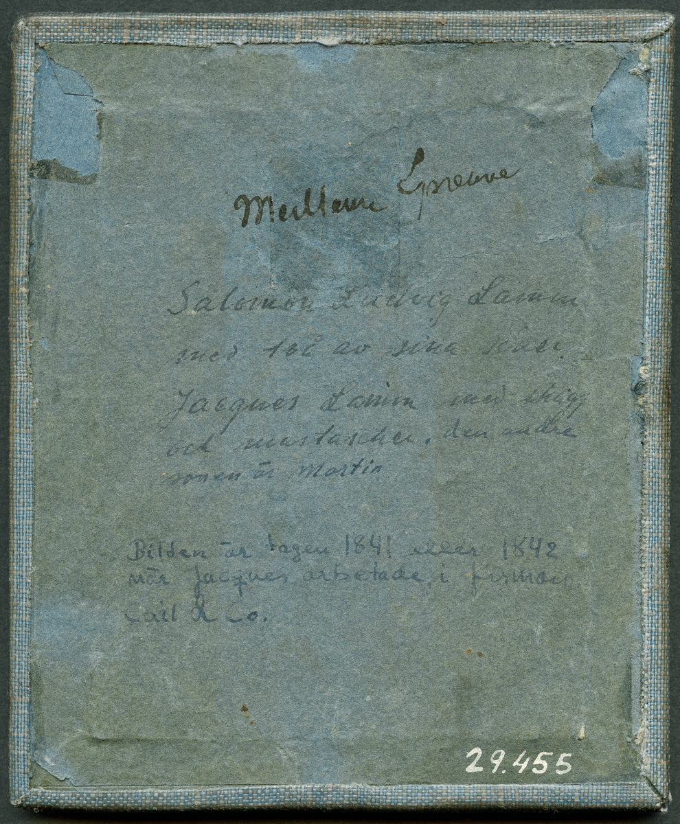 Baksidan av daguerreotyp. Porträtt av Industriidkaren Salomon, Ludvig Lamm (1786-1857) med sönerna Jacques (1817-1891) och Martin (1824-1878). Bilden är tagen när Jacques arbetade i firman Cail & Co.