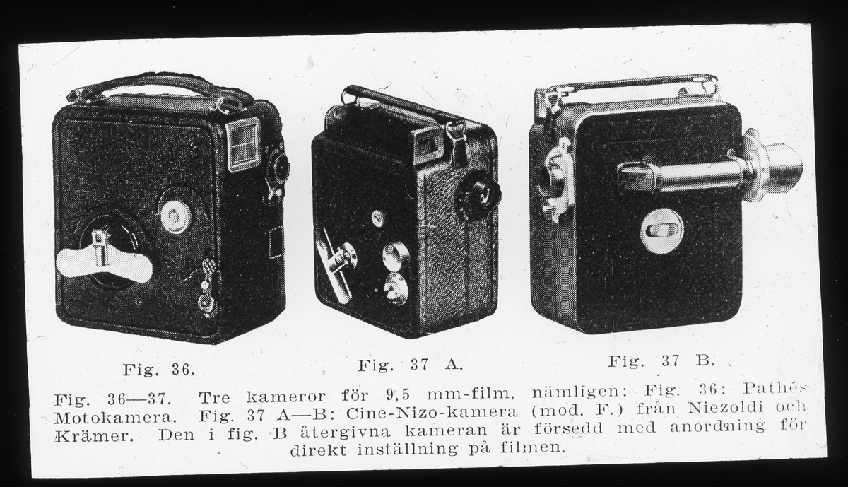 Tre för 9,5 mm film. 36: Pathés Motokamera. 37 A-B: Cine-Nizo-kamera (mod. F.) från Niezoldi och Krämer. Den i figur B återgivna kameran är försedd med annordning för direkt inställning på filmen.