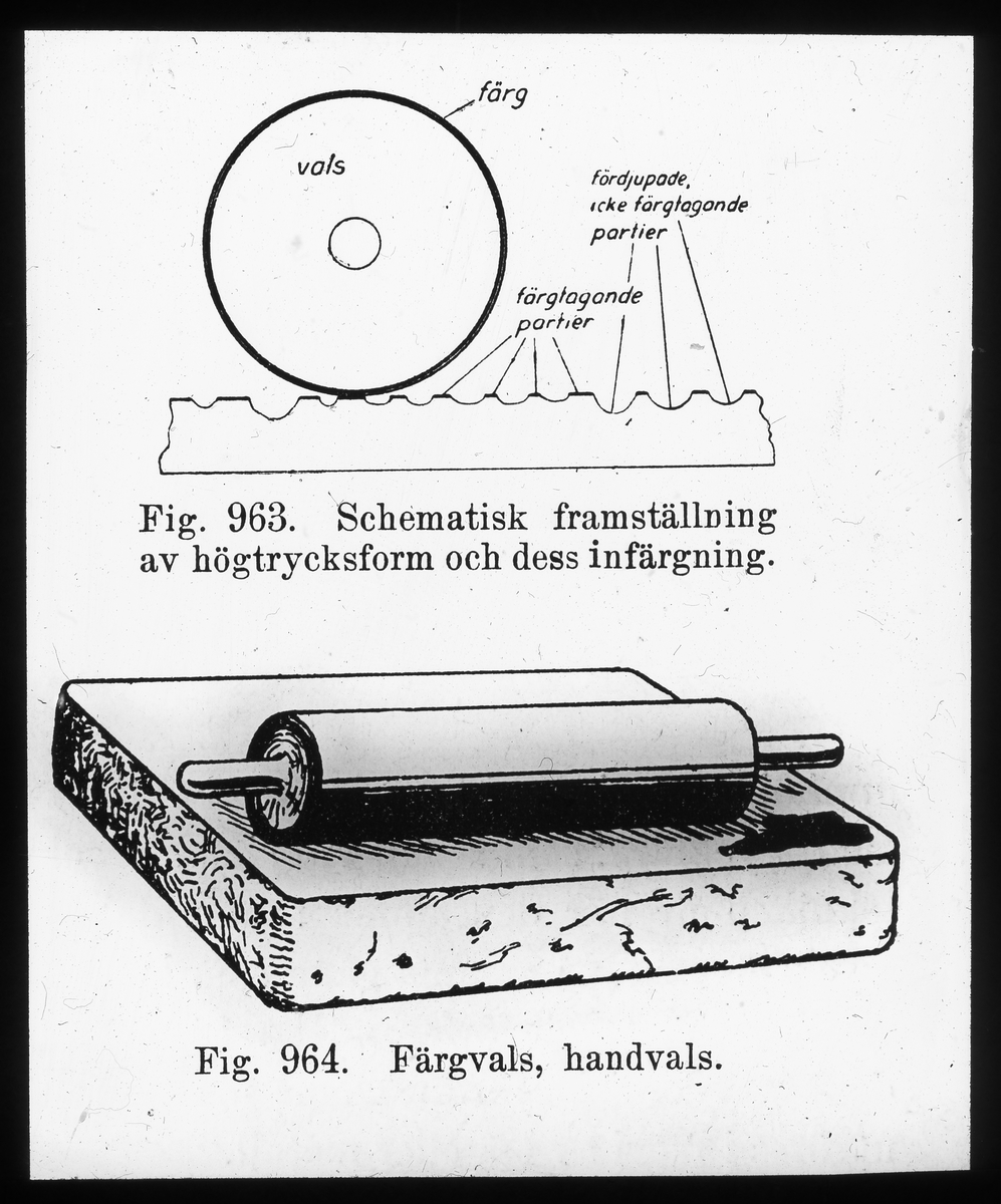 Övre bilden: Schematisk framställning av högtrycksform och deras infärgning. Undre bilden: Färgvals, handvals.