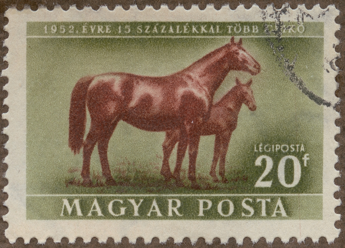 Frimärke ur Gösta Bodmans filatelistiska motivsamling, påbörjad 1950. Frimärke från Ungern, 1951. Motiv av Sto med fölunge