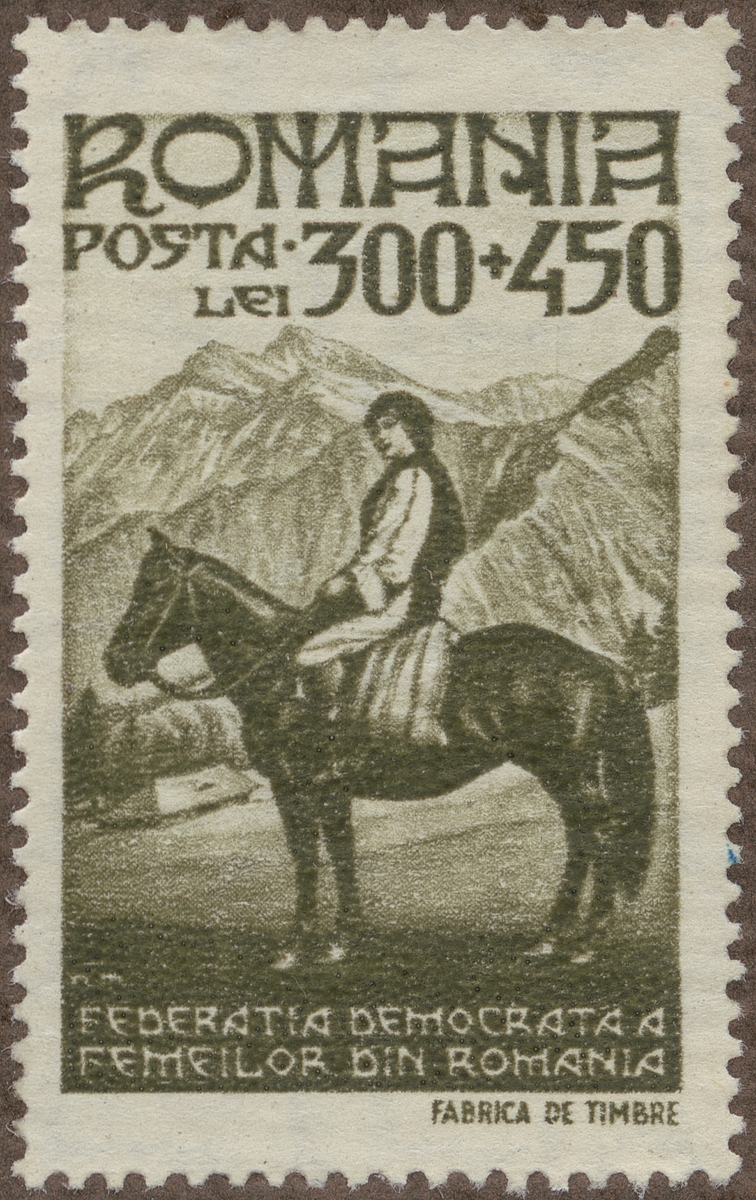 Frimärke ur Gösta Bodmans filatelistiska motivsamling, påbörjad 1950. Frimärke från Rumänien, 1946. Motiv av Kvinnligt bud till häst "-Propaganda för kvinnligt arbete-"