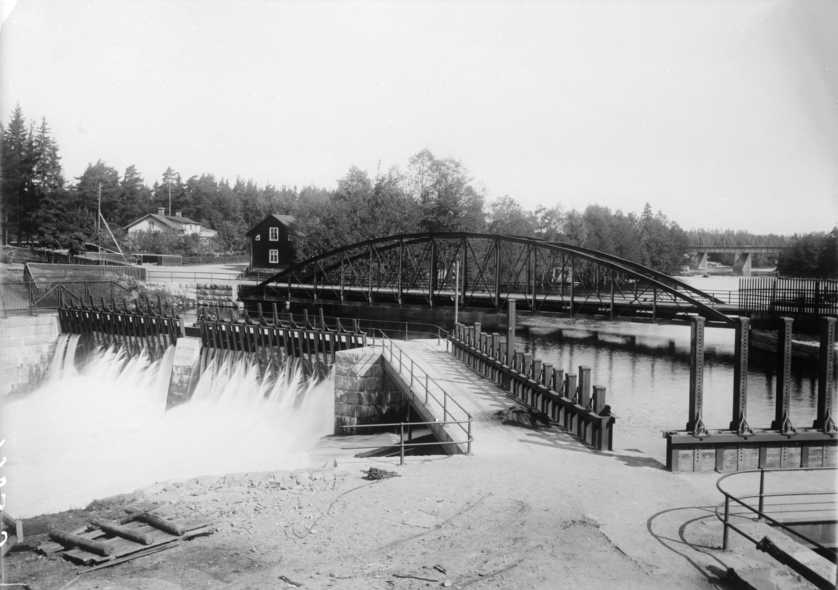 Fotografi för produktion av vykort. Landsvägsbron och dammen i Degerfors.