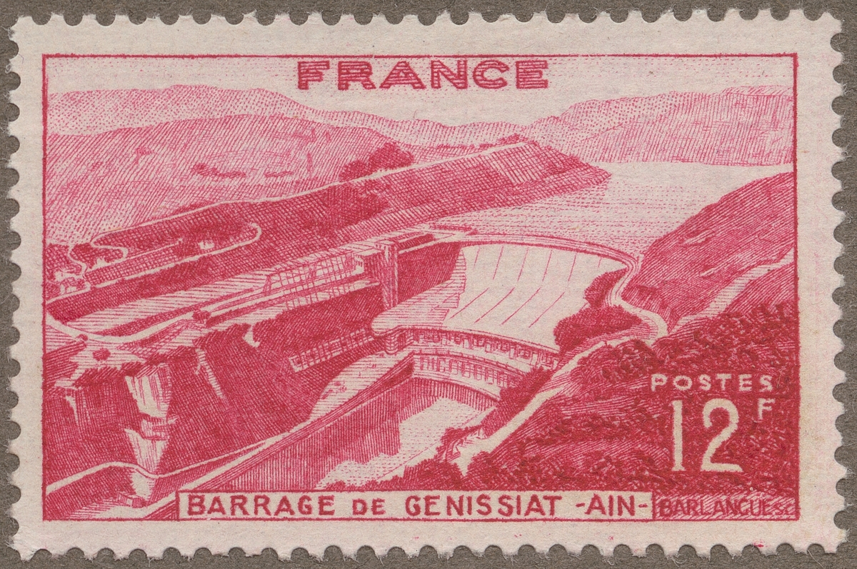 Frimärke ur Gösta Bodmans filatelistiska motivsamling, påbörjad 1950. Frimärke från Frankrike, 1948. Motiv av Fransk kraftverksdamm vid Genissiat.-Ain.