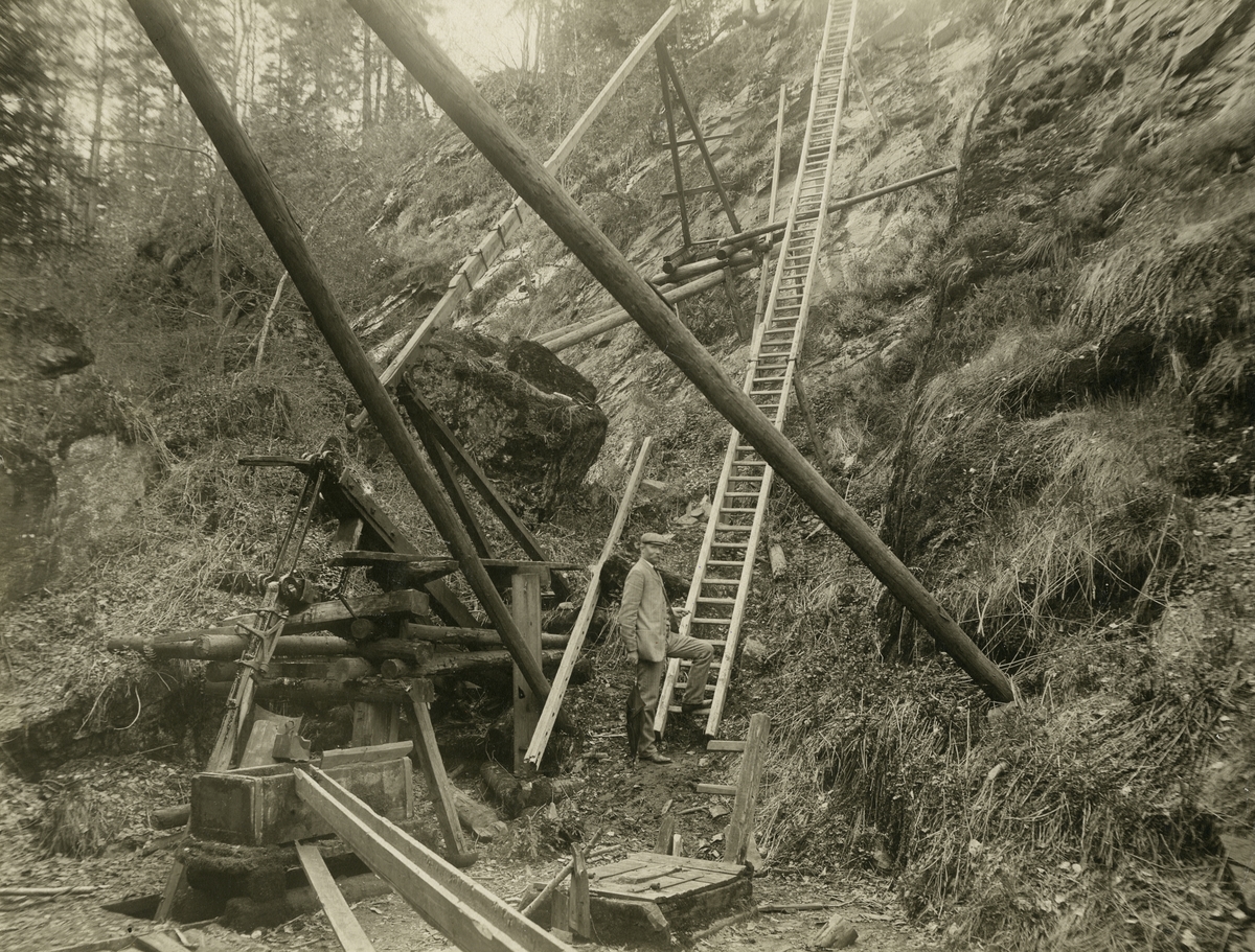 Nedgång till gammal gruva vid Älvestorp i Västmanland 1907.