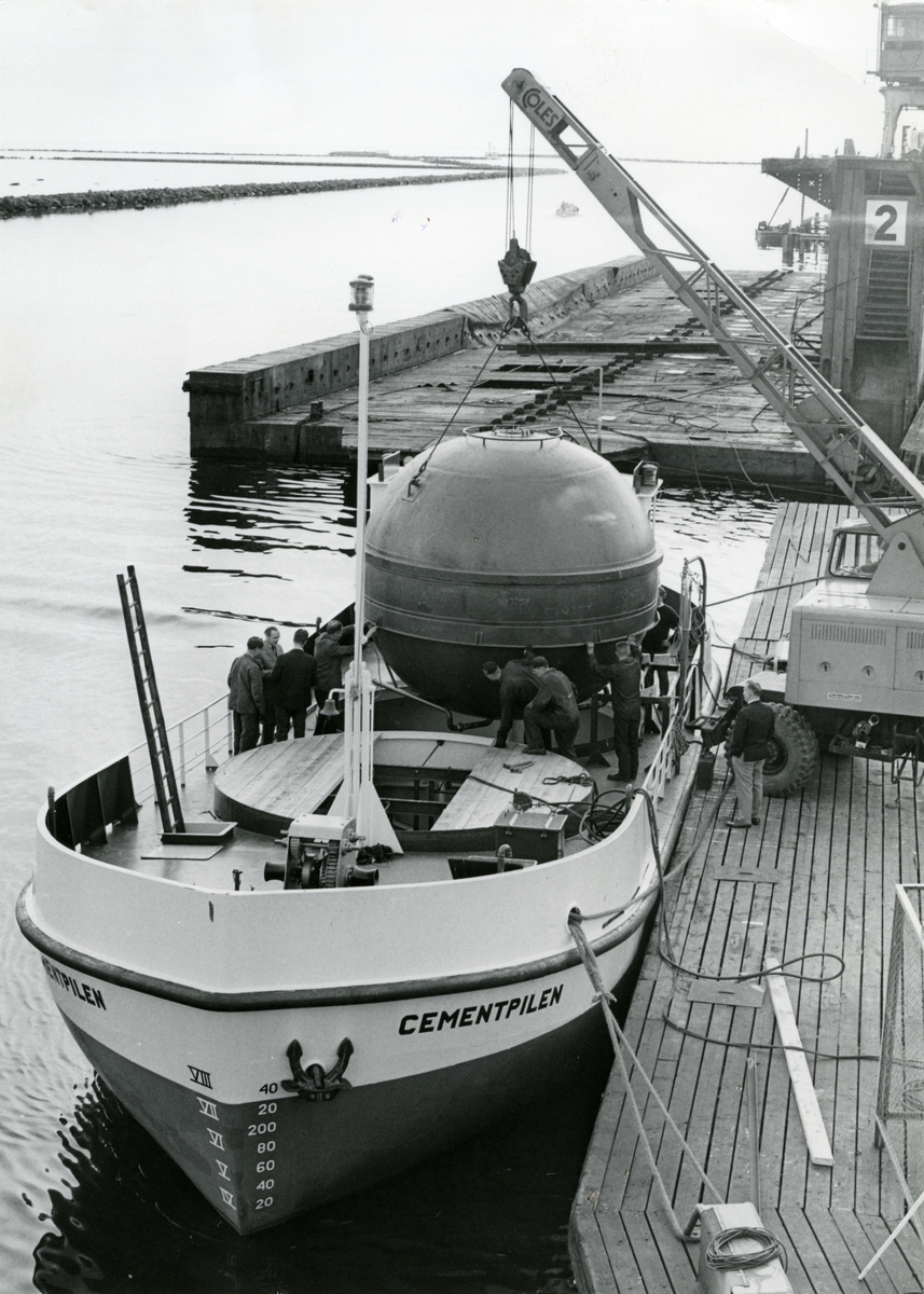 Lastning av sfärisk transportör på båten Cementpilen, för sjötransport av cement.