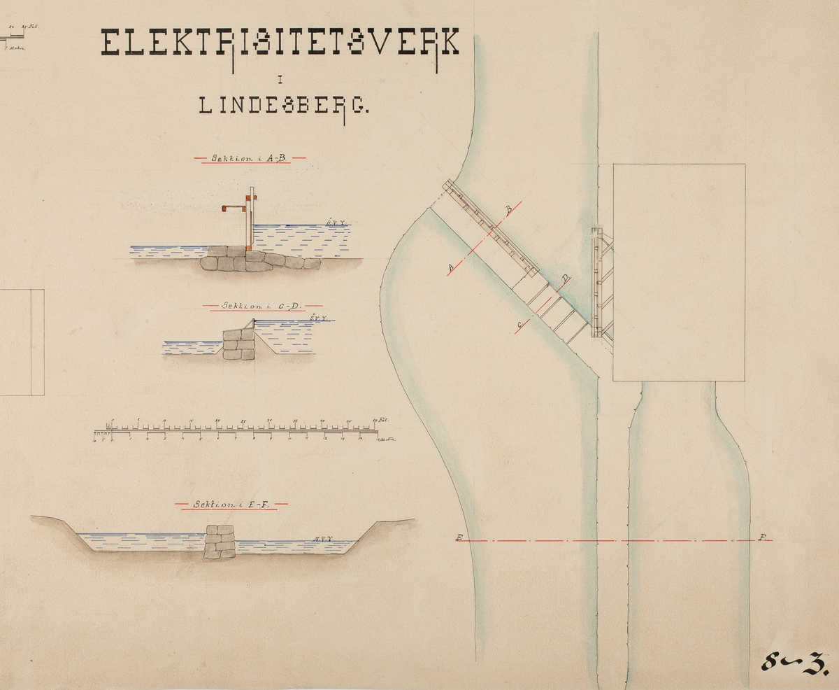 Delförstoring av ritning över förslag till Lindesbergs elektricitetsverk.