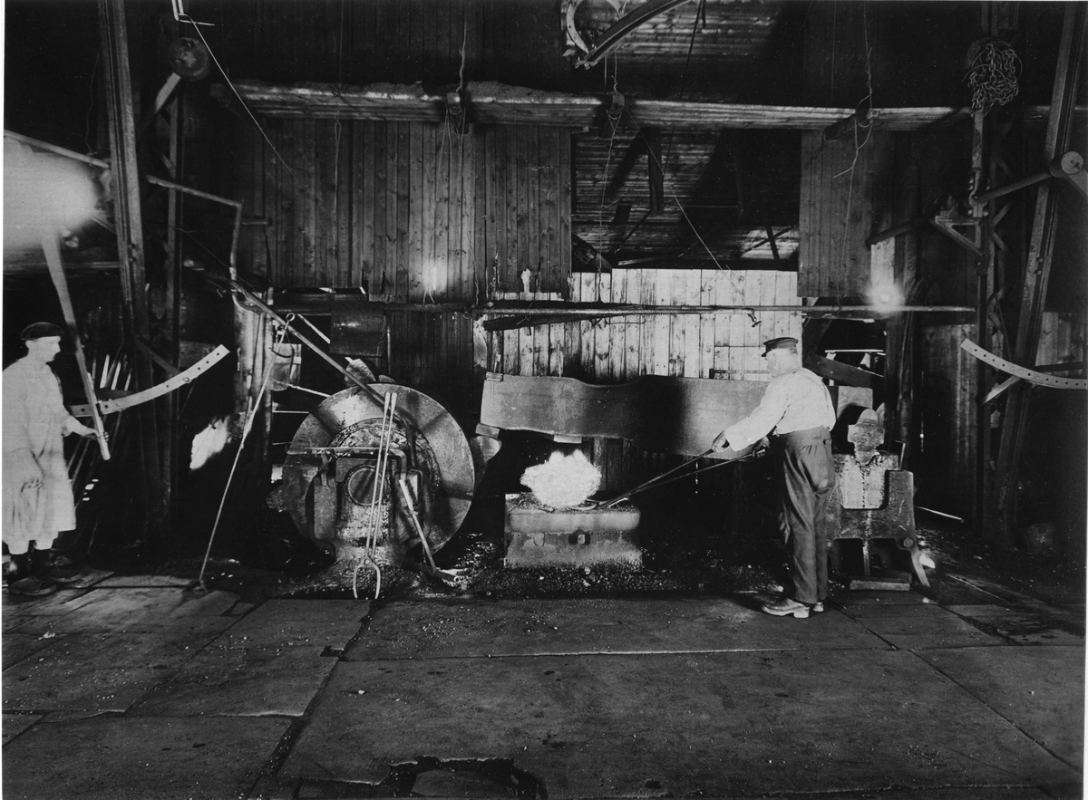 Interiör av smältsmedjan, smälthammare. Boxholms bruk.