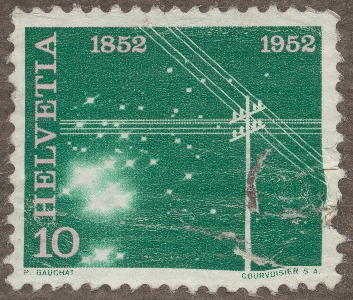 Frimärke ur Gösta Bodmans filatelistiska motivsamling, påbörjad 1950. Frimärke från Schweiz, 1952. Motiv av Symbol för telefoni "100-årsjubileum 1852-1952"