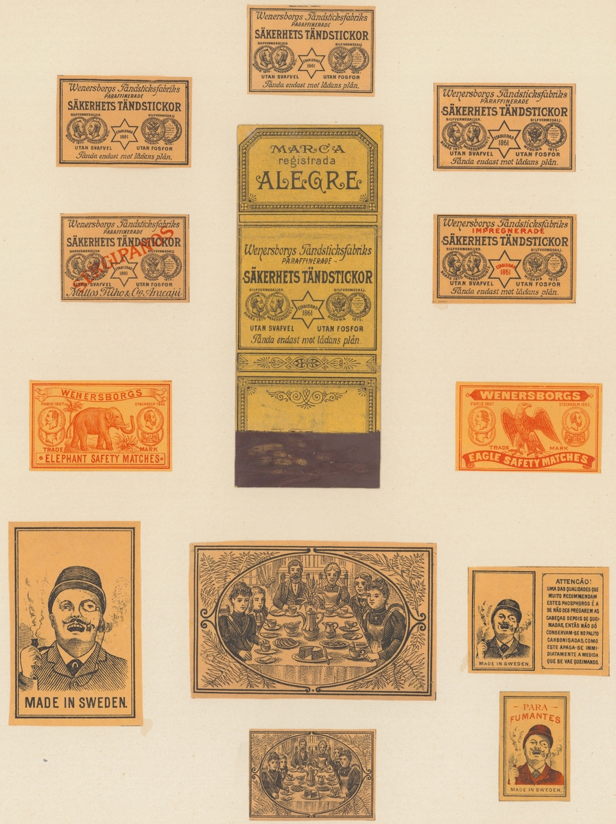 Etiketter för tändsticksaskar, från Svenskt Industri- och Handelsmuseum.