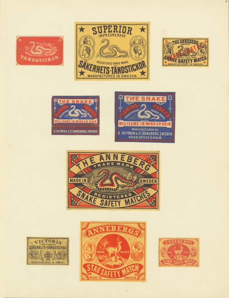 Etiketter för tändsticksaskar, från Svenskt Industri- och Handelsmuseum.