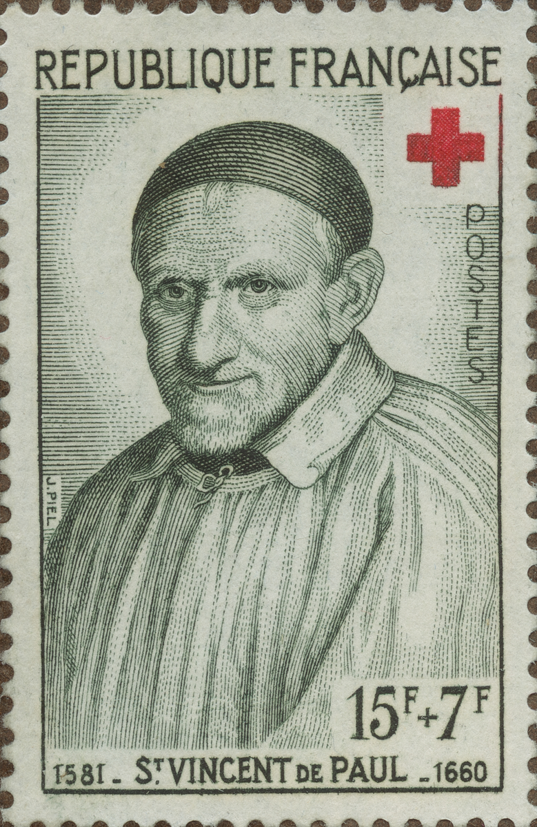 Frimärke från Frankrike, 1958. Motiv av S:t Vincent de Paul 1581-1660 Kristlig välgörare "Lazarister" "Serie till förmån för Röda Korset"