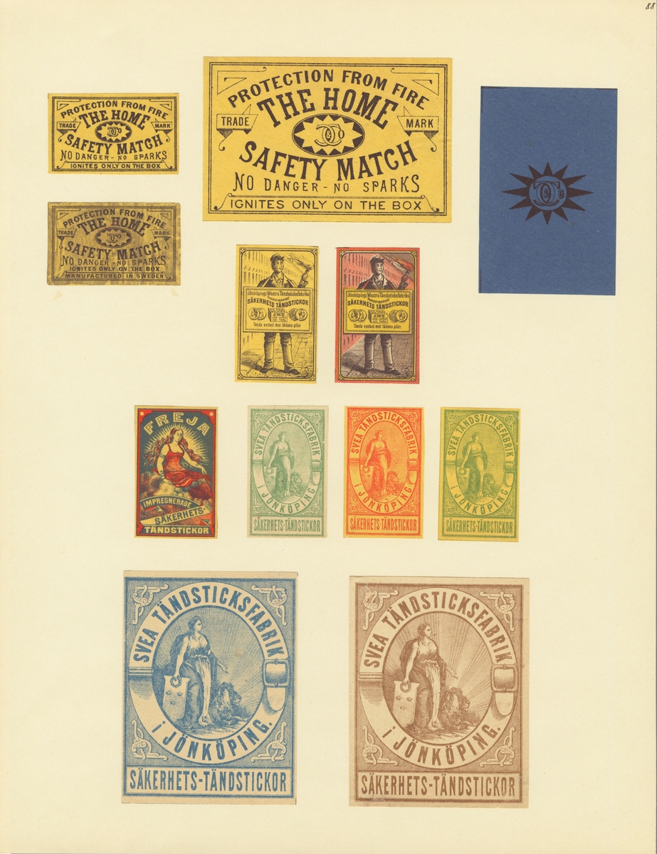 Etiketter för tändsticksaskar, från Svenskt Industri- och Handelsmuseum.