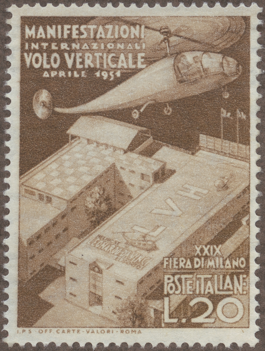 Frimärke från Italien, 1951. Motiv av Helikoptern "Volo verticale" över "Leonardo da Vinci helikopterhamn", belägen på byggnadens tak. "- 29-de mässan i Milano 1951-"