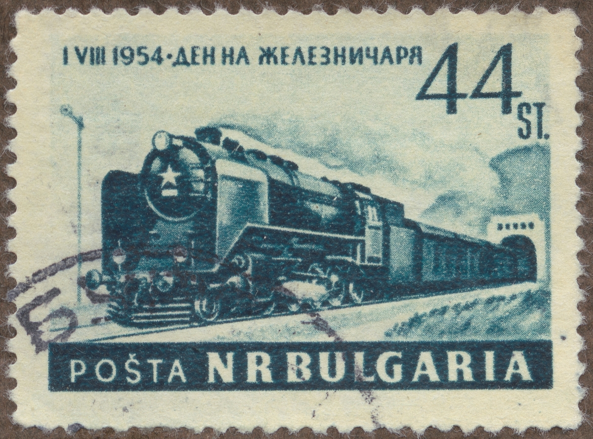 Frimärken ur Gösta Bodmans filatelistiska motivsamling, påbörjad 1950. Frimärke från Bulgarien, 1954. Motiv av Järnvägståg med Ånglok "-Järnvägens Dag: 1 augusti 1954 -"