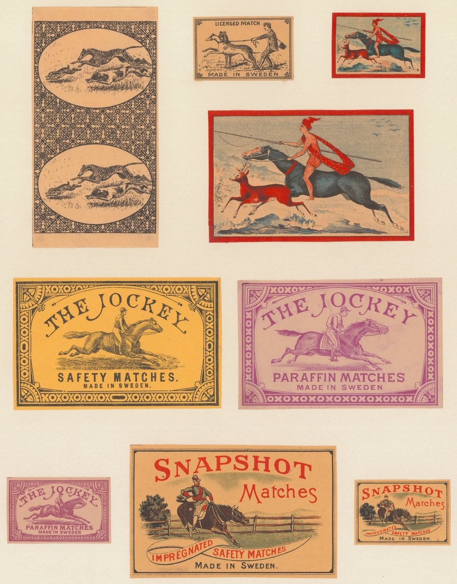 Etiketter för tändsticksaskar, från Svenskt Industri- och Handelsmuseum.