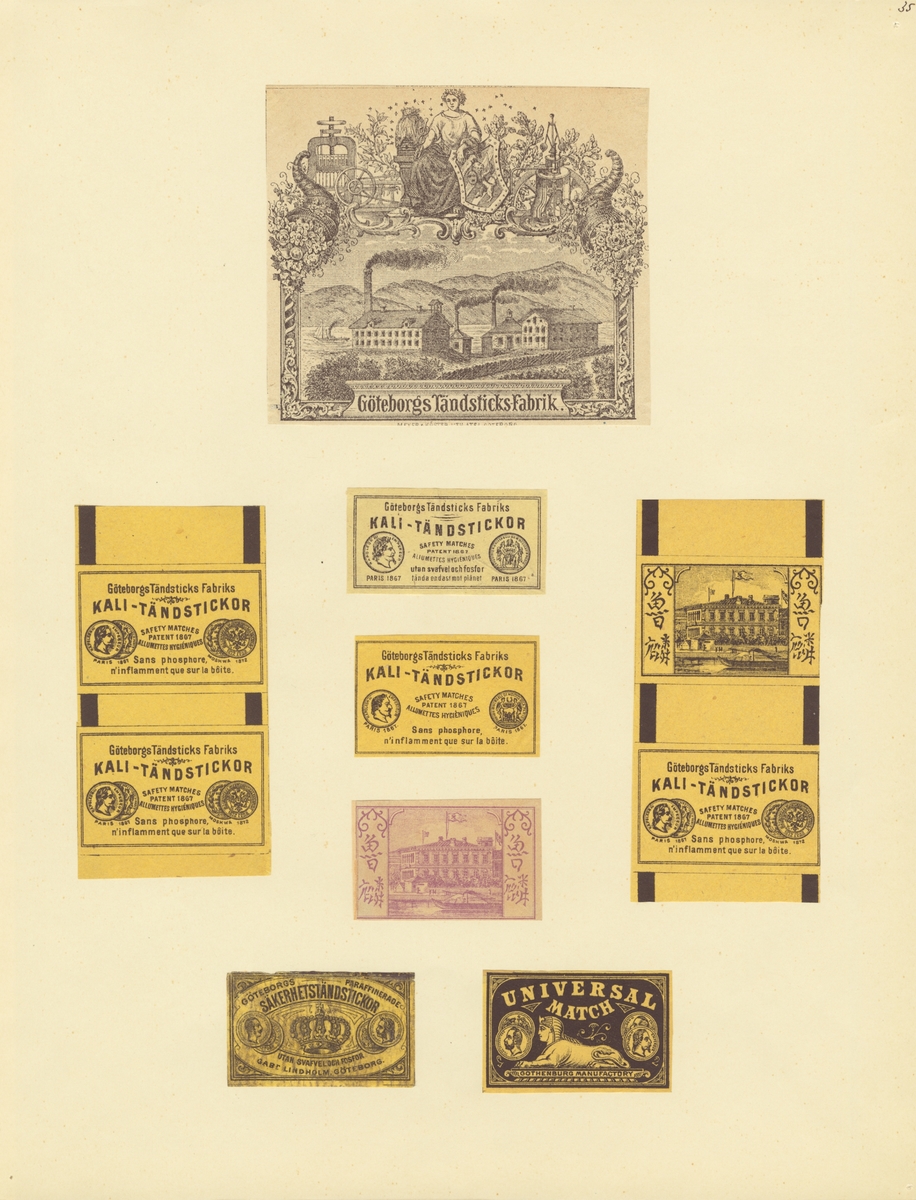 Titel: Etiketter för tändsticksaskar, från Svenskt Industri- och Handelsmuseum. (Göteborgs Tändsticksfabrik).