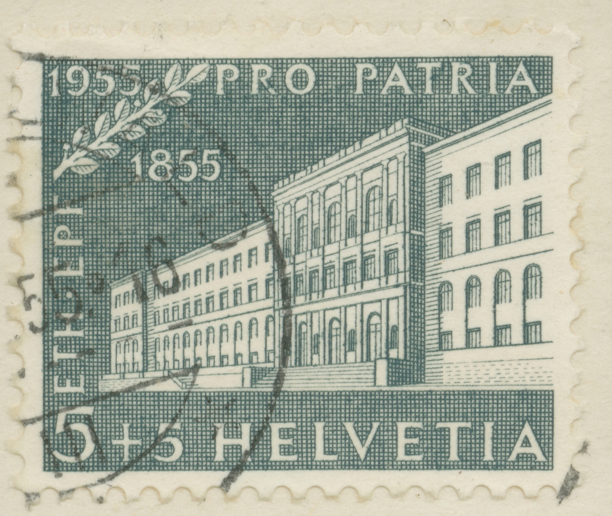 Frimärke från Schweiz, 1955. Motiv av Teknologisk Institut i Zürich. "100-år: 1855-1955".