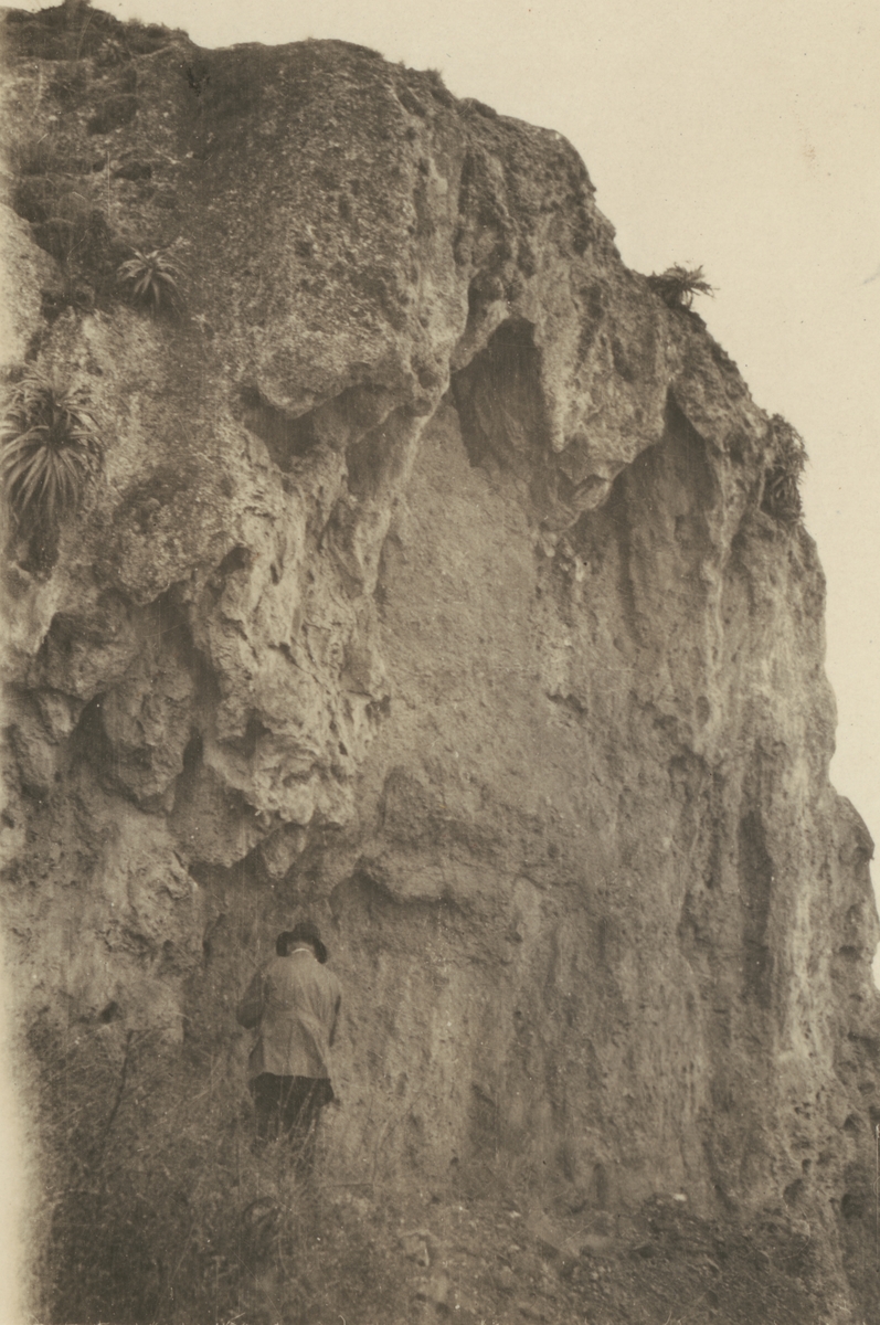 Fotografi från kuvert märkt med "Ernst Nordenskjöld". Motiv av man som står nedanför ett berg.