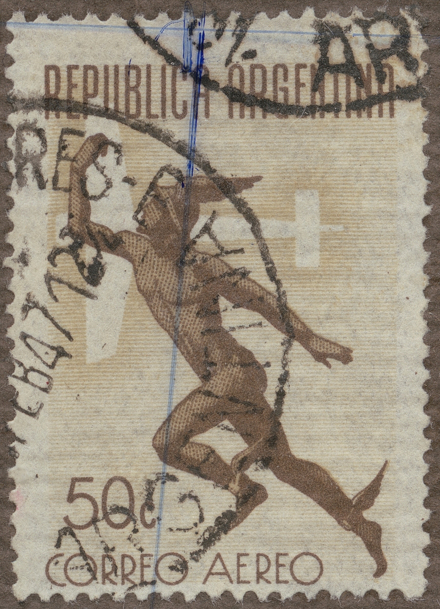 Frimärke från Argentina, 1943. Motiv av "Merkurius" och flygplan "- Symbol för flygpost-"