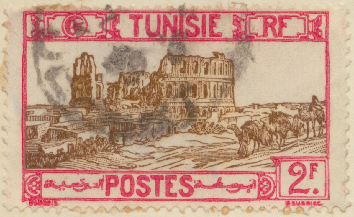 Frimärke från Tunisien, 1958. Motiv av Kamelkaravan framför Amfiteatern El Djem