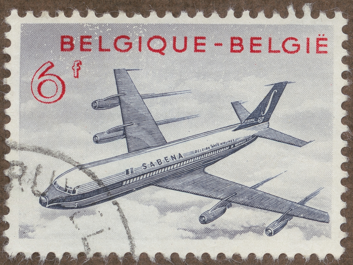Frimärke från Belgien, 1959. Motiv av Fyrmotorigt belgiskt monoplan, Boeing 707 jet "Minne om flygbolaget Sabena:s upptagande av jet-flygning"