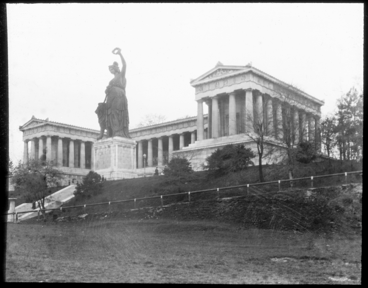 Skioptikonbild från institutionen för fotografi vid Kungliga Tekniska Högskolan. Motiv föreställande monumental byggnad med skulptur framför föreställande en kvinnogestalt som håller en lagerkrans i handen och med ett lejon vid sin sida. Bilden är troligen tagen av John Hertzberg under en resa i Europa.