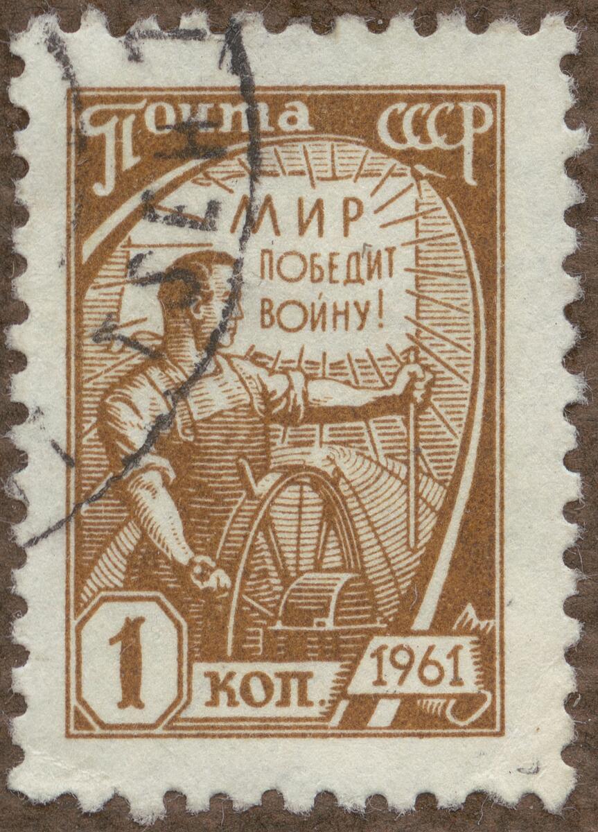 Frimärke från Ryssland, 1961. Motiv av Rysk maskinarbetare. (inskription): Freden besegrar kriget.