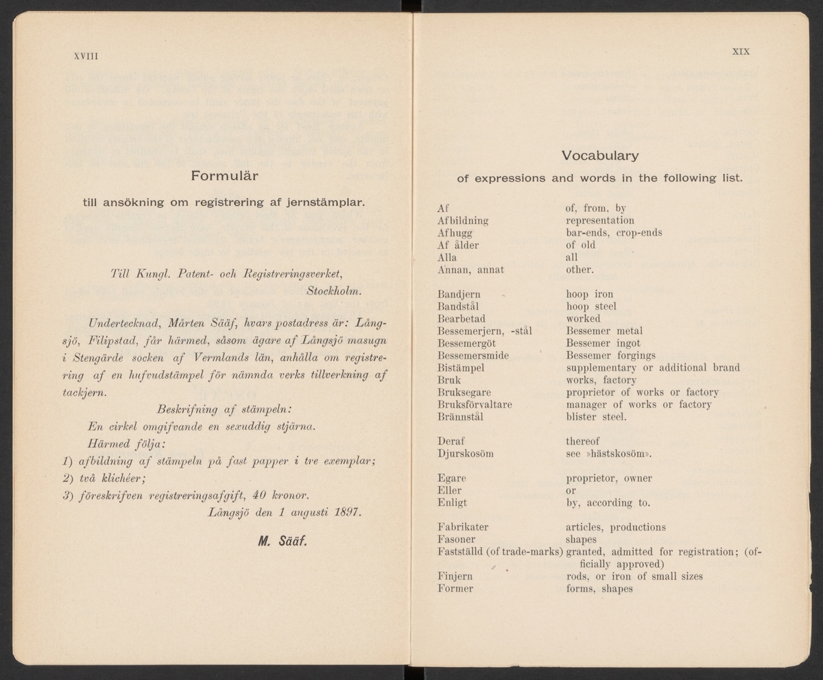 Titel: Svenska järnstämplar 1897. Tryckt. Ur Carl Sahlins bergshistoriska samling.