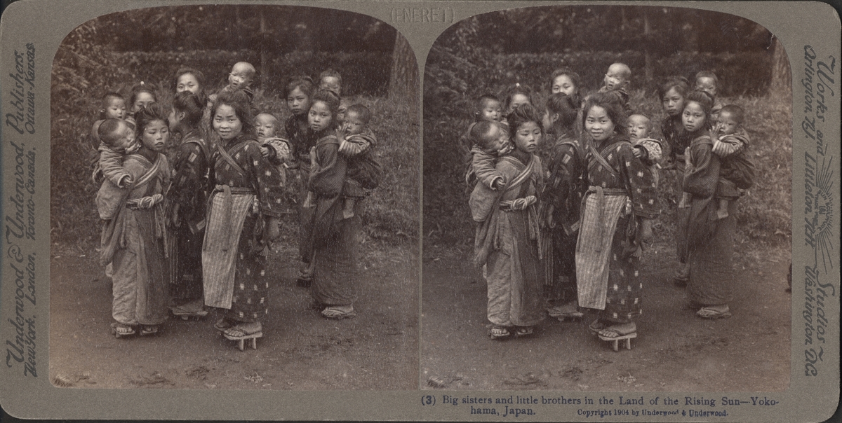 Stereobild av flickebarn med deras mindre bröder i "Land of the rising sun" Yokohama, Japan.