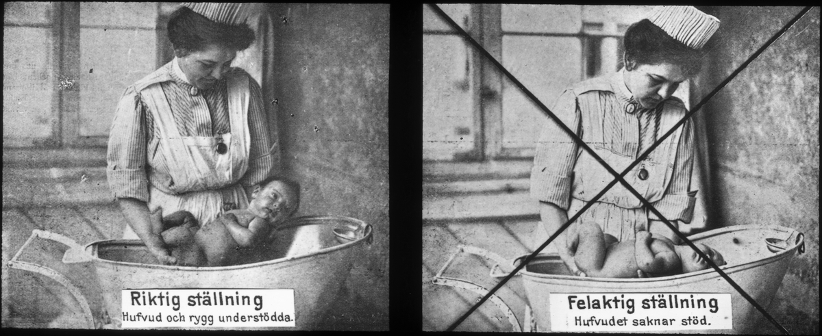 Skioptikonbild med motiv från Arbetarskyddsstyrelsen arbetsplatsdokumentationer. Instruktioner i hur man badar ett spädbarn.