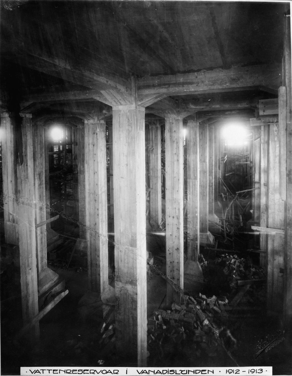 Titel: Byggherre: Byggnadsaktiebolaget Contractor, Stockholm. Vattenreservoar i Vanadislunden. Interiör.