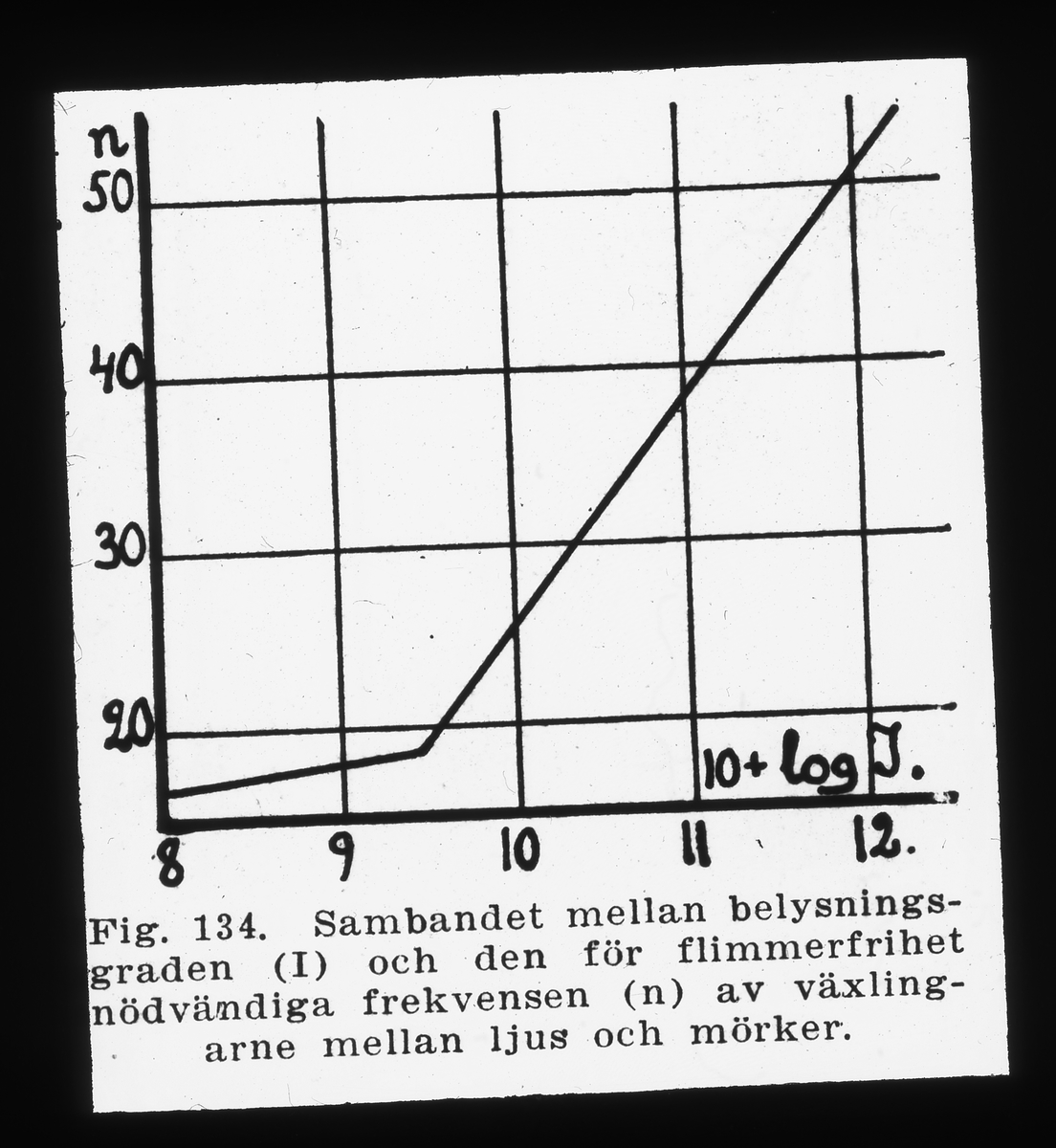 Sambandet mellan belysningsgraden (I) och den för flimmerfrihet nödvändiga frekvensen (n) av växling-arne mellan ljus och mörker.