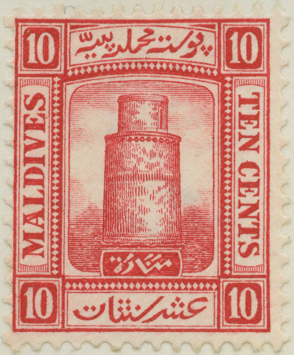 Frimärke från Maldiverna, 1909. Motiv av minaret vid Malé.