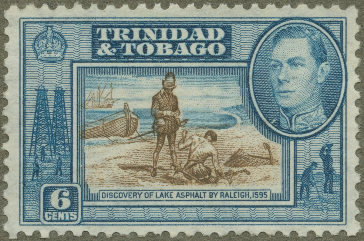 Frimärke från Trinidad, 1935. Motiv av Asfaltsjö på Trinidad upptäckt år 1595 av Sir Walter Raleigh, Västindien.