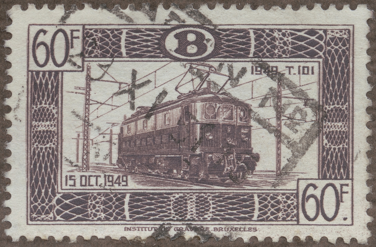 Frimärken ur Gösta Bodmans filatelistiska motivsamling, påbörjad 1950. Frimärke från Belgien, 1949. Motiv av El-Lokomotiv Belgien 1949 T 101