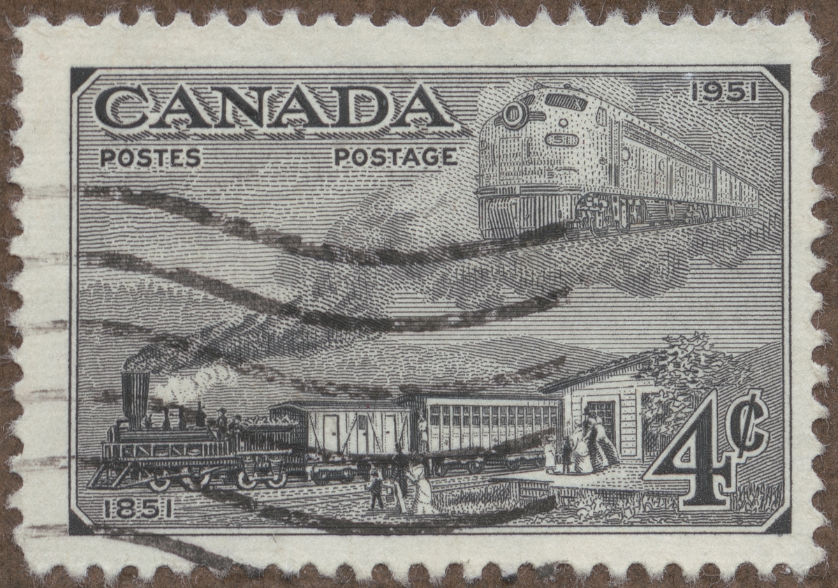 Frimärken ur Gösta Bodmans filatelistiska motivsamling, påbörjad 1950. Frimärke från Canada, 1951. Motiv av Ånglokomotiv av 1851 och 1951 "Brittisk nordamerikansk postväsendet 100 år: 1851-1951."