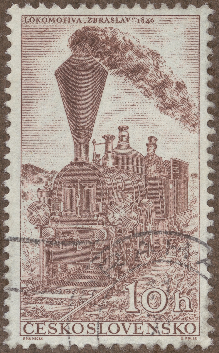 Frimärken ur Gösta Bodmans filatelistiska motivsamling, påbörjad 1950. Frimärke från Tjeckoslovakien, 1956. Motiv av Ångloket "Zbraslav" av år 1846. "-Serie: Lokomotiv.-"