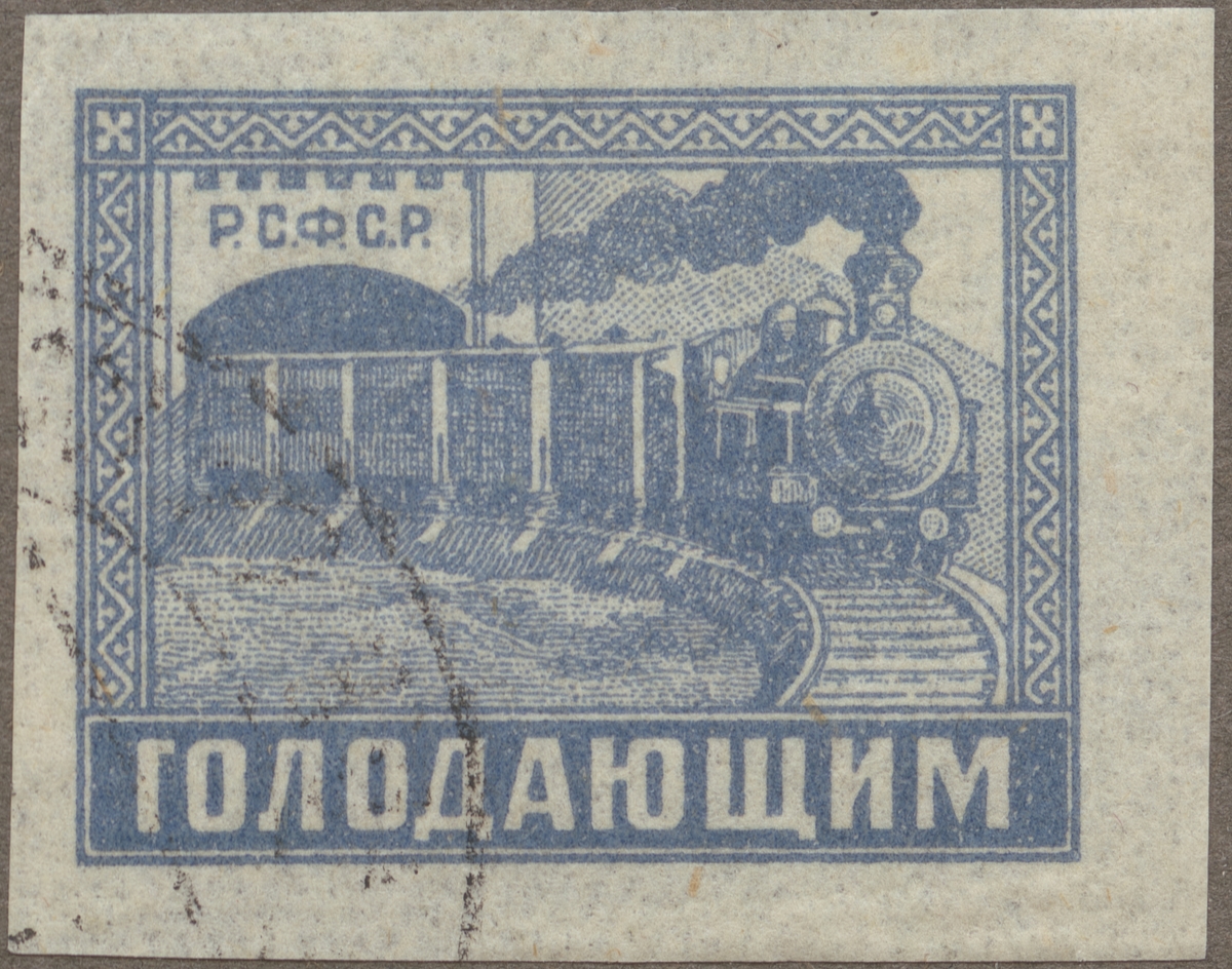 Frimärken ur Gösta Bodmans filatelistiska motivsamling, påbörjad 1950. Frimärke från Ryssland 1922. Motiv av Järnväg i Ryssland. "- till förmån för fattigas bespisning -"