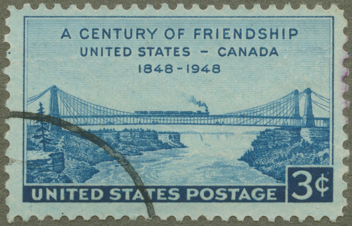 Frimärke från USA, 1948. Motiv av Förbindelsebron mellan USA och Canada nedanför Niagara-fallet. 100-årsjubileum av färd mellan de båda länderna.