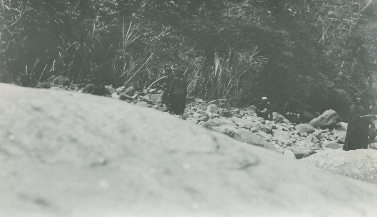 Fotografi från expedition till Peru 1920. Motiv av en grupp människor som vilar sig bland stenar i djungeln.