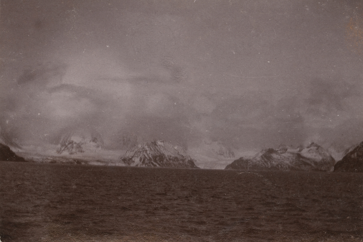 Fotografi från första svenska Antarktisexpeditionen 1901-1904. Vy över hav, snötäckta berg och molnprydd himmel.
