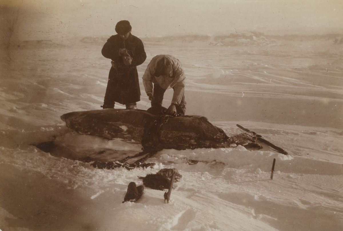 Fotografi från första svenska Antarktisexpeditionen 1901-1904. Motiv av två män som styckar en säl i ett snölandskap.
