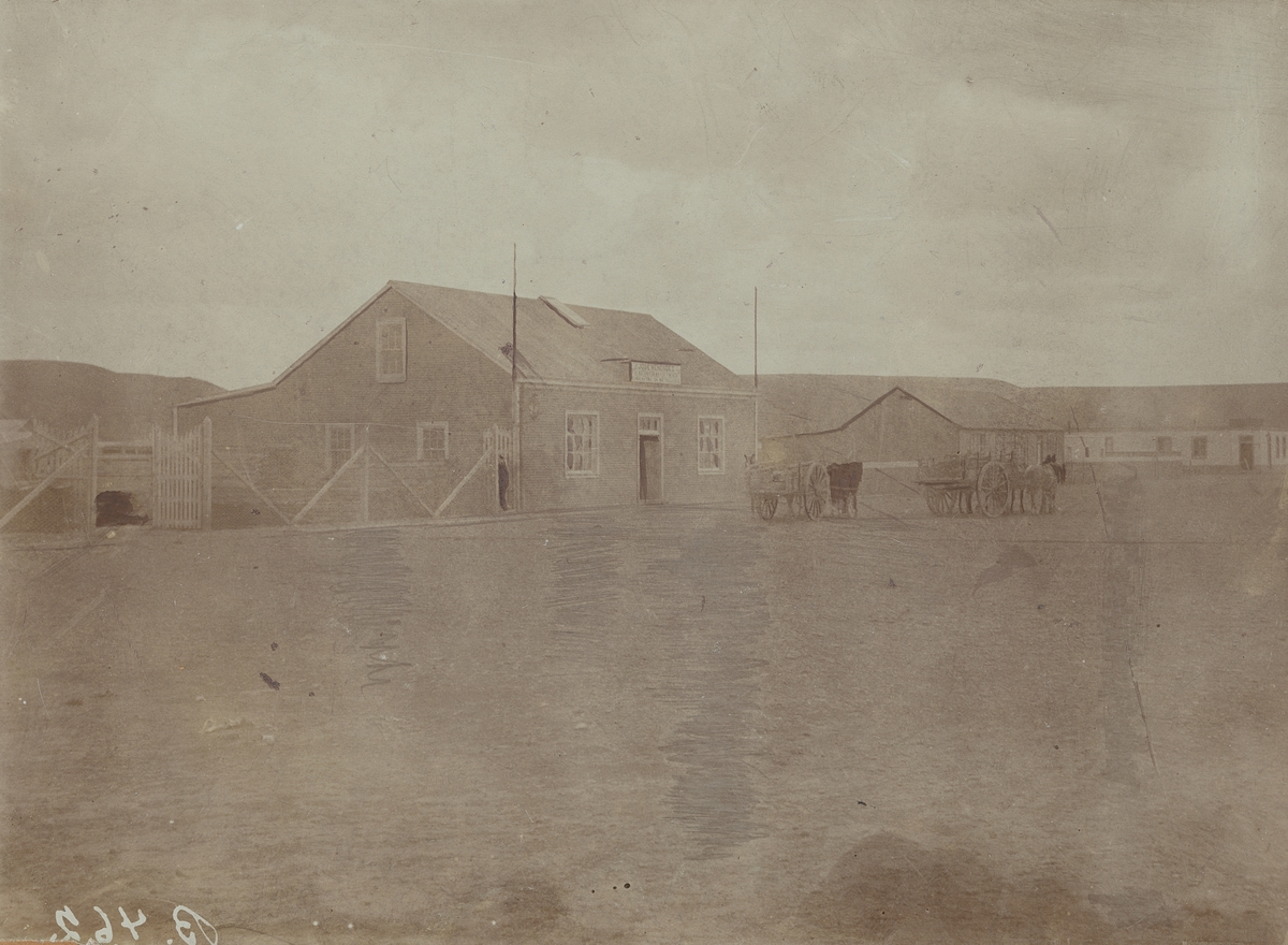 Fotografi från första svenska Antarktisexpeditionen 1901-1904. Motiv av hästar spända framför kärror utanför hus.