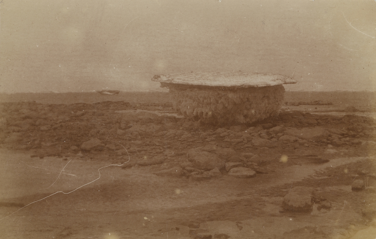 Fotografi från första svenska Antarktisexpeditionen 1901-1904. Motiv av vad som ser ut att vara del av ett isberg på en stenig strand.