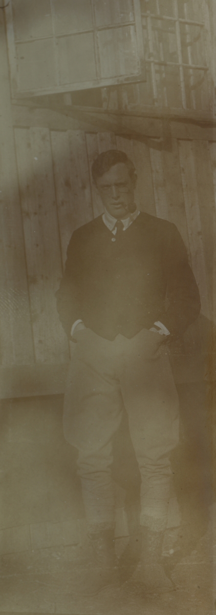 Fotografi från expedition till Spetsbergen. Motiv av man som poserar framför hus vägg.