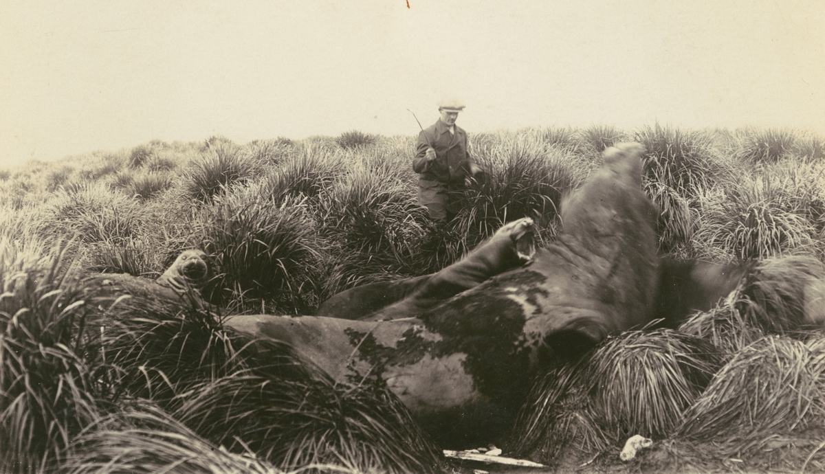 Bild från expedition i Antarktisområdet. Motiv av sjöelefanter på land bland buskar, 1928.